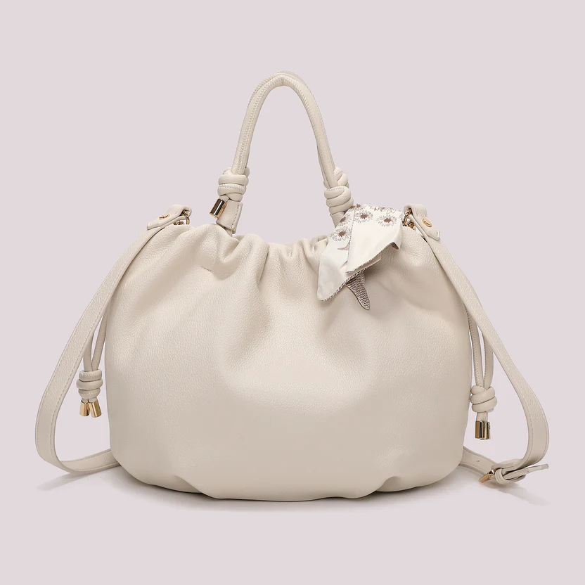 🇫🇷 Ce sac à main en éco-cuir/synthétique couleur crème, agrémenté d’une touche élégante avec le foulard, est l’accessoire parfait pour toute tenue.