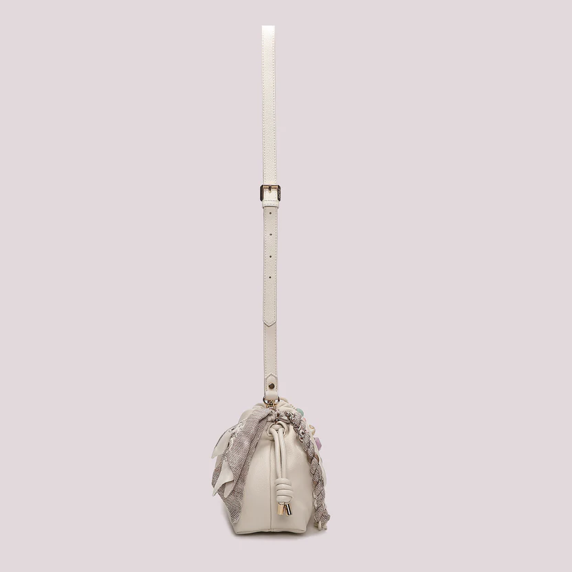🇬🇧 **Description in English:** Add a touch of elegance and functionality to your wardrobe with the Mimì Muà crossbody bag, enhanced by a delightful cream scarf. Perfect for any occasion!
