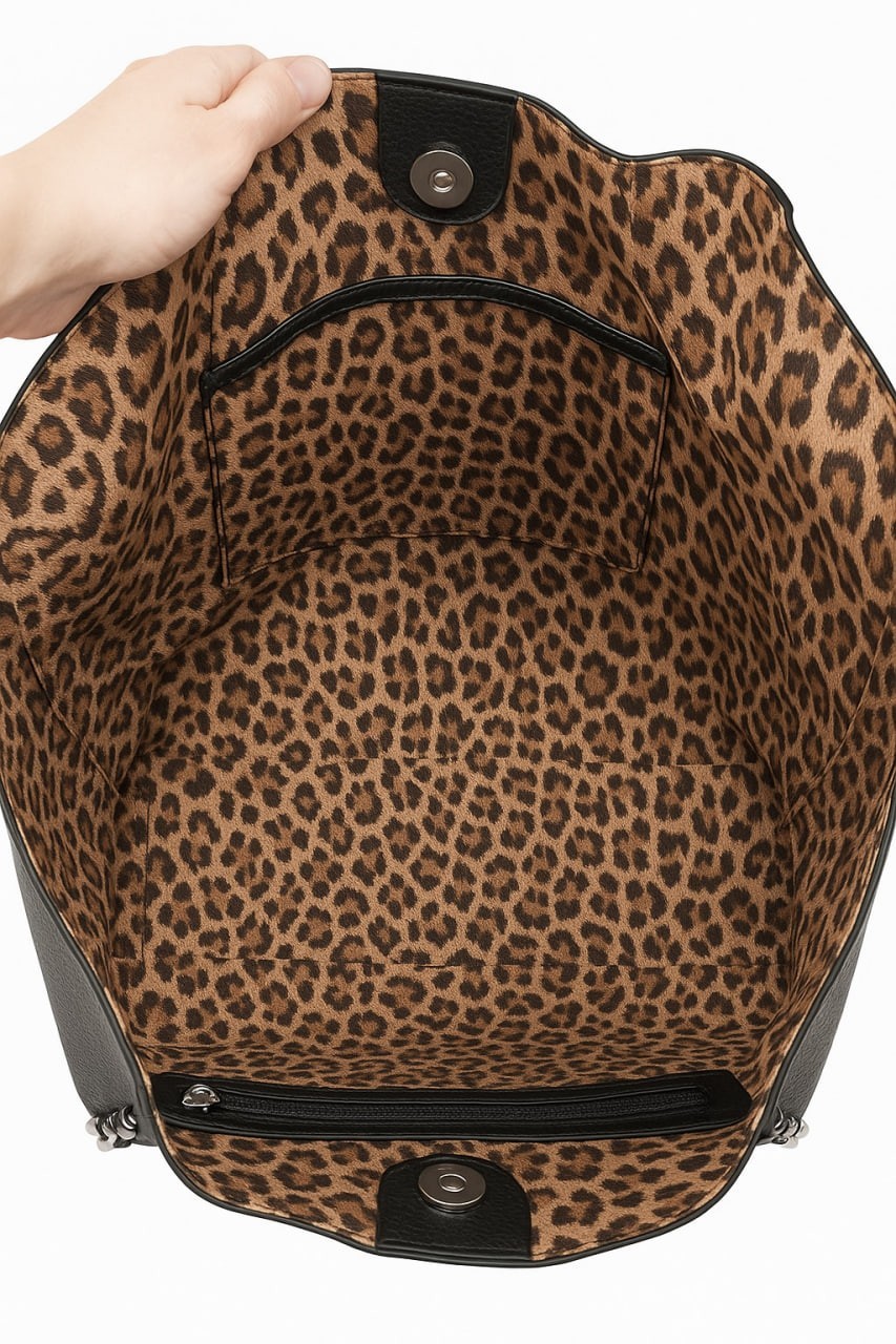 L’interno, completamente foderato in tessuto animalier, è dotato di tasca con zip e tasche multifunzione per riporre ogni oggetto in modo pratico. La chiusura con bottone magnetico garantisce sicurezza e rapidità.