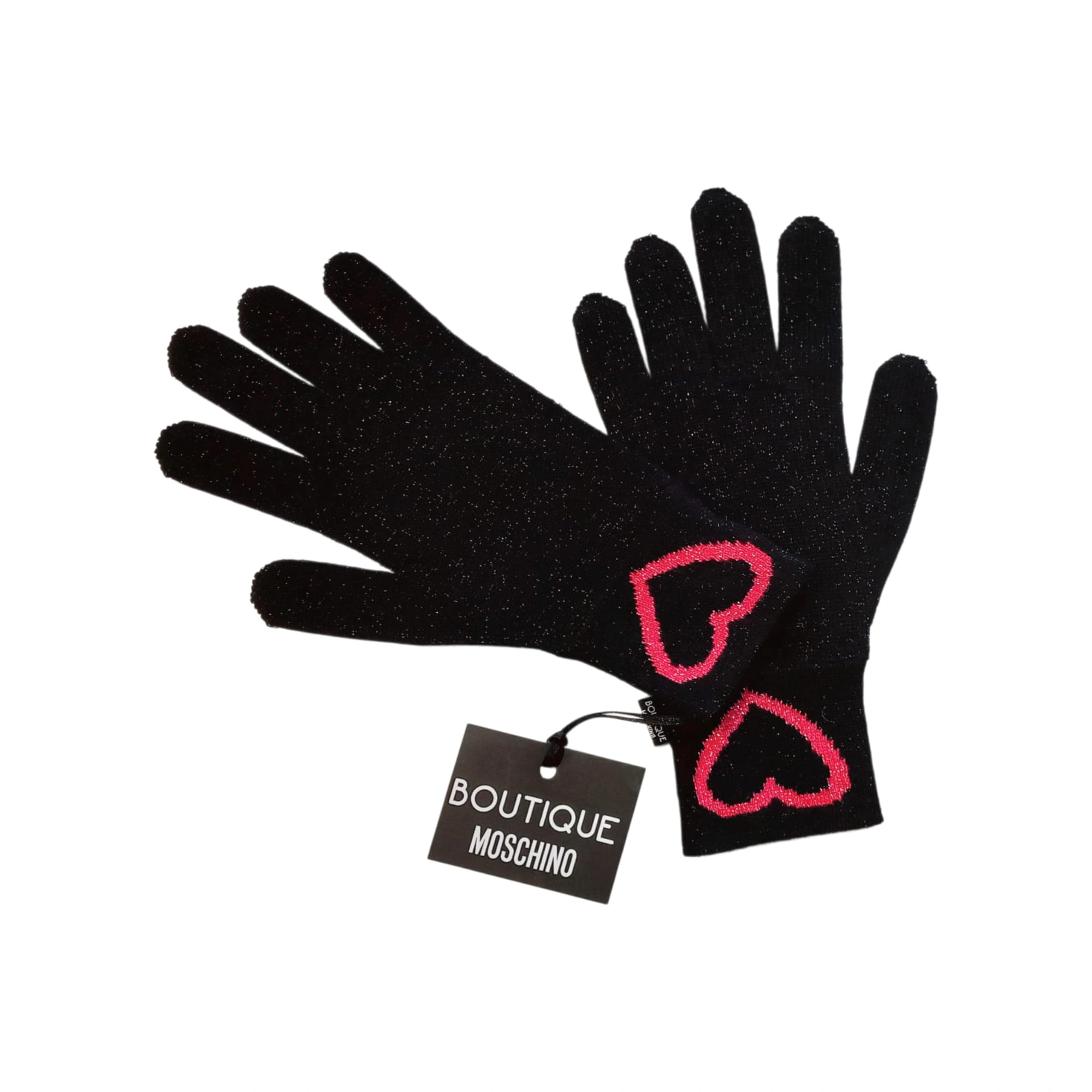 Guanti Boutique Moschino da donna in maglia nera con dettagli luminosi e iconico ricamo a cuore rosso sul polso.