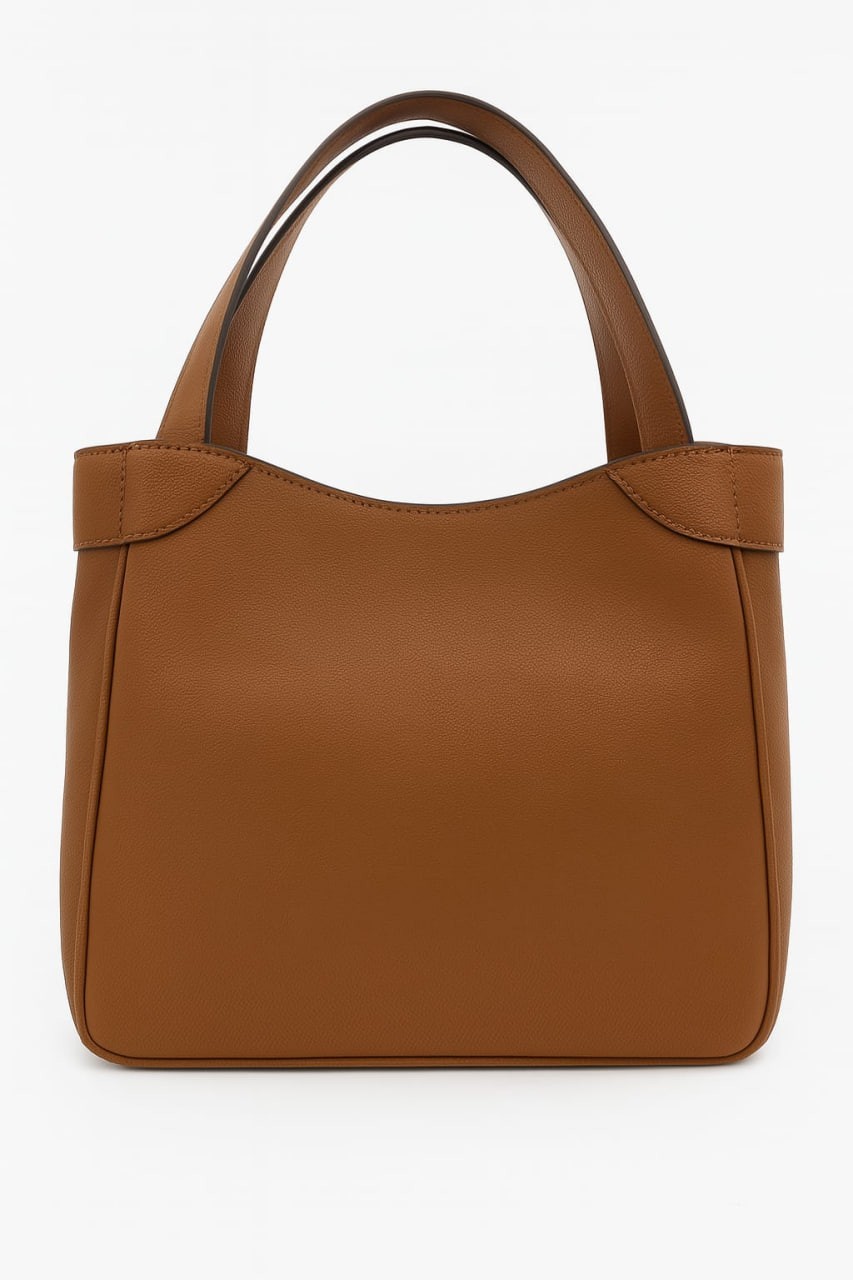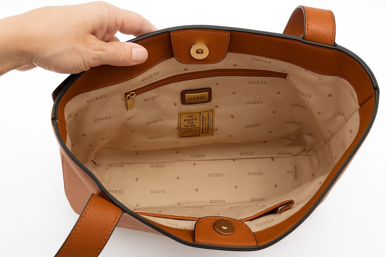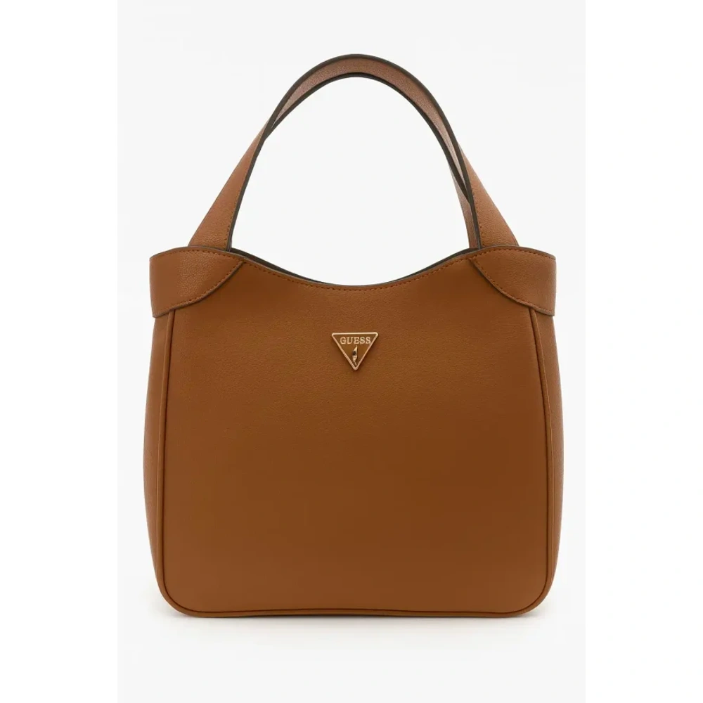 Un design moderno e raffinato per la borsa firmata GUESS, perfetta per accompagnare i tuoi outfit quotidiani con stile. Realizzata in ecopelle martellata color cognac, è dotata di interni spaziosi con fodera logata e dettagli dorati.