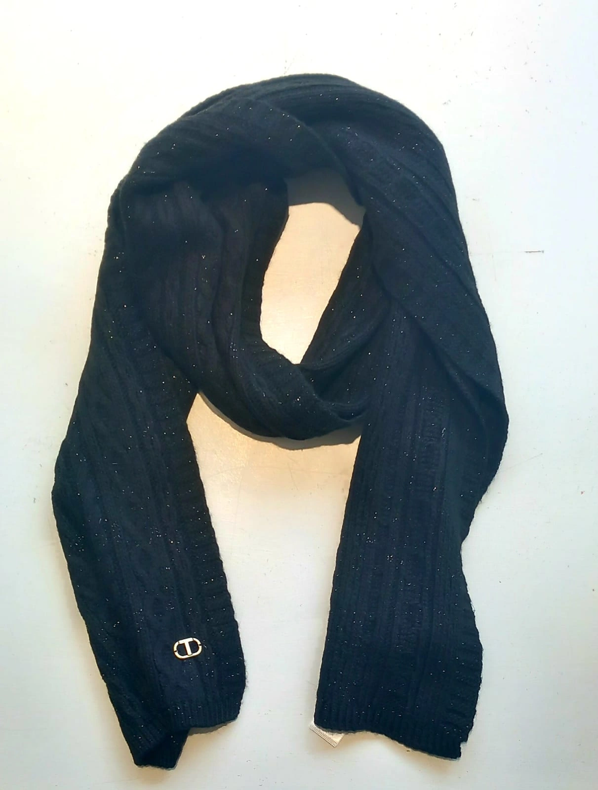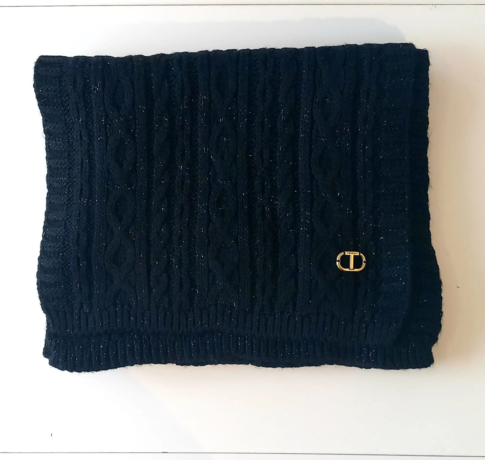 Elegante sciarpa Twinset da donna in maglia intrecciata nera, realizzata con lavorazione a trecce e filato con leggera luminosità.